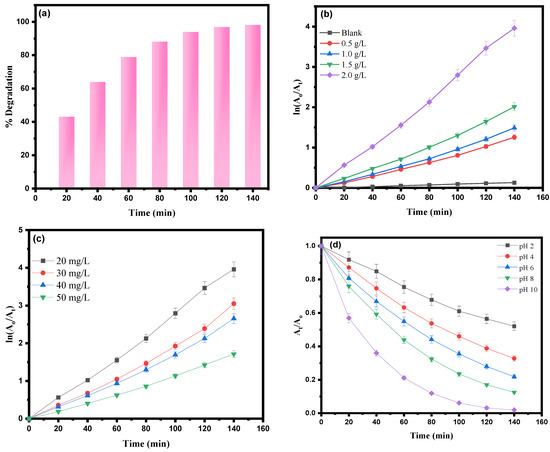 (a) Percentage degradation of RhB molecules via ZnFe2O4-Cu, (b) Langmuir–Hinshelwood kinetic model of photocatalytic degradation of RhB dye with various catalyst dosages, (c) Langmuir–Hinshelwood kinetic model of photocatalytic degradation of RhB dye with different dye concentrations, and (d) effect of pH on RhB dye photodegradation.