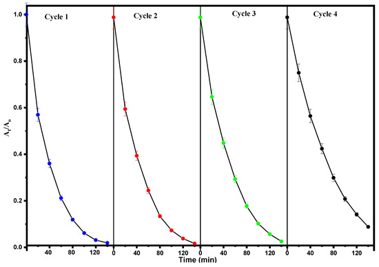 Figure 12 illustrates how, during four successive cycles, RhB dye molecules were found to degrade by 98–90% in the presence of visible light at total exposure times of 560 min when ZnFe2O4-Cu nanomaterials were used as nanocatalysts. The results obtained regarding the recyclability of ZnFe2O4-Cu highlight its potential as a nanocatalyst in the photodegradation process of RhB dye molecules. The negligible decline in the efficiency of ZnFe2O4-Cu as a nanocatalyst after four consecutive cycles can be attributed to the loss of the ZnFe2O4-Cu nanomaterial sample during each cycle’s collection and centrifugation procedure.