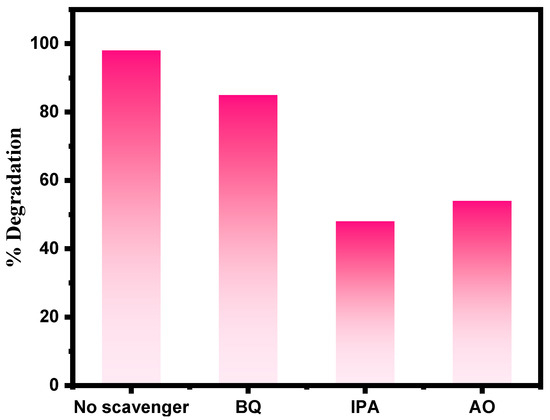 In general, reactive oxygen species play an essential role in photocatalysis, including superoxide radical anion () hydroxyl radical (•OH), and holes (h+). To evaluate the role of active species in the photodegradation process, suitable scavengers were added to suspensions of RhB dye degradation in the presence of ZnFe2O4-Cu. Benzoquinone (BQ), isopropyl alcohol (IPA), and ammonium oxalate (AO) were added to capture (), (•OH), and (h+) respectively, as shown in Figure 13. The RhB dye degradation dropped to 48% and 54% when (IPA) and (AO) were added, whereas the presence of (BQ) resulted in greater RhB dye degradation (85%). Hence, the major species involved in RhB dye degradation by ZnFe2O4-Cu composite during photodegradation were (•OH), followed by (h+), and then ().