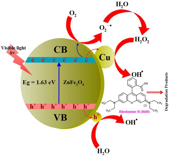 Photo-assisted degradation of RhB dye molecules was expected to take place when reactive oxidative species are generated, such as superoxide radical anion () hydroxyl radical (•OH), electron (e−), and holes (h+) in a photolytic reaction as depicted in Figure 14. Light-induced photocatalysis occurs in the presence of visible light radiations, where electrons on VB of ZnFe2O4 nanomaterials are excited to CB, leaving behind holes in VB. Excited electrons of CB carry out reduction reactions on the catalyst surface, while holes of VB are responsible for oxidation reactions. Additionally, Cu NPs cause a surface plasmon resonance effect that transfers free electrons to the conduction band of ZnFe2O4 when their energies exceed the potential of the conduction band. As a result of Schottky energy barriers, hot electrons transferred to ZnFe2O4 cannot return to Cu NPs. The injection of hot electrons into ZnFe2O4 causes thermal holes to remain on Cu particles, which causes oxidation [122,123,124,125]. The RhB dye photodegradation involves both reduction and oxidation reactions.