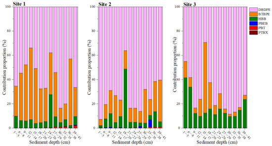As shown in Figure 2, DBDPE was the predominant NBFR in sediment cores, with its contribution proportions being up to 58 ± 15%, 73 ± 15%, and 71 ± 18% in the corresponding sediment cores. Additionally, BTBPE and HBB were another two main NBFRs in sediment cores. The contribution proportions of BTBPE were 34 ± 15%, 17 ± 8%, and 12 ± 15% in sediment cores 1, 2, and 3, respectively, whereas HBB accounted for 7 ± 6%, 9 ± 12%, and 17 ± 10% of ∑6NBFRs in corresponding sediment cores. As for the remaining three NBFRs (PBEB, PBT, and pTBX), they were minor NBFRs in sediment cores, with their total contribution proportions ranging from 0.03% to 6.79%. Similarly, the composition profiles of NBFRs in studied sediment cores were consistent with those of DBDPE, BTBPE, HBB, PBT, and PBEB in sediments from another two primary e-waste recycling sites in China, with average contributions of 71%, 16%, 12%, 0.66%, and 0.01%, respectively, in Taizhou and of 68%, 28%, 3%, 0.16%, and 0.01%, respectively, in Guiyu [8,9]. In addition, DPDPE, BTBPE, and HBB were generally determined to be the three dominant NBFRs in sediments of rivers, lakes, wetlands, and seas from all over the world, such as the highly industrialized saltwater lake in Korea [23], the Pearl River Estuary in South China [15], and the Challenger Deep in the Mariana, Mussau, and New Britain trenches [31]. The composition profiles of NBFRs in sediments could be related to their global production and usage volume. The global production volume of DBDPE was 4540~22,700 megagrams in 2006 and increased to 22,700~45,400 megagrams in 2012 [32], while the global production volume of BTBPE was estimated to be 5000 megagrams in 1997 and increased to >16,000 megagrams in 2001 [33,34]. Additionally, the annual production volumes of HBB, PBEB, and PBT were 350 megagrams in 2001, 4.54~227 megagrams in 1986, and 1000~5000 megagrams in 1997 [35,36].