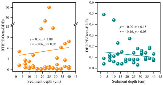 Of these, DBDPE and BTBPE were mainly used as alternatives to Deca-BDEs and Octa-BDEs, respectively [35]. Our previous study reported the concentration variations of PBDEs in the same sediment cores, with the concentrations ranging from 65 to 1,030,000 ng/g dw [18]. The concentration ratios of BTBPE to Octa-BDEs (BTBPE/Octa-BDEs) and DBDPE to Deca-BDEs (DBDPE/Deca-BDEs) could be used to trace the replacement rates of NBFRs compared to traditional BFRs. Because Deca-BDEs mainly consist of BDE209 and Octa-BDEs are dominated by BDE153, 183, 196, and 197, the concentrations of these congeners were used to calculate BTBPE/Octa-BDEs and DBDPE/Deca-BDEs. As shown in Figure 3, the BTBPE/Octa-BDEs and DBDPE/Deca-BDEs varied from 0.12 to 60 (AV ± SD: 5.16 ± 12) and from 0.03 to 0.49 (0.12 ± 0.10), respectively. Obviously, the ratios of DBDPE/Deca-BDEs were much lower than those of BTBPE/Octa-BDEs in sediment cores, which might be caused by the significantly higher concentrations of Deca-BDEs (range: 35.2~967,417 ng/g dw) than Octa-BDEs (range: 4.18~3000 ng/g dw). The ratios of DBDPE/Deca-BDEs in the current study were much lower than those reported in non-e-waste recycling sites, such as in sediment from the Dalian Bay (mean: 3.1) and Sishili Bay (9.2) in China [37], and a highly industrialized bay in Korea (range: 0.84~28) [38]. In addition, the ratios of both BTBPE/Octa-BDEs and DBDPE/Deca-BDEs had no clear increase trends with the sediment depth decreasing (Figure 3). However, the increase in DBDPE/Deca-BDEs with time was reported in dated sediment cores from a highly industrialized saltwater lake in Korea [23]. These results suggested that the replacement of traditional BFRs with NBFRs was hysteretic relative to those in industrial and manufacturing areas and that traditional BFRs are still predominant pollutants in e-waste recycling sites.
