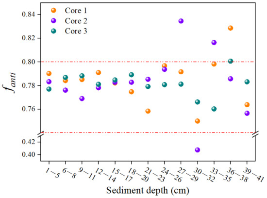 The commercial product of DP is primarily a mixture of two stereoisomers, anti-DP and syn-DP, with the fanti values (the concentration ratios of anti-DP to the sum of anti-DP and syn-DP) theoretically stabilizing around 0.75, but varying from 0.60 to 0.80 due to variations in product source and batch [39]. Additionally, it may also contain minor byproducts (e.g., anti-Cl11-DP and anti-Cl10-DP). In the current study, the concentrations of anti-Cl11-DP and anti-Cl10-DP were 27.61 ± 41.62 and 0.63 ± 0.94 ng/g dw in core 1, 17.26 ± 28.60 and 0.63 ± 1.24 ng/g dw in core 2, and 111 ± 159 and 5.01 ± 7.79 ng/g dw in core 3, respectively (Table 1). The total contribution proportions of anti-Cl11-DP and anti-Cl10-DP were lower than 1% in all depth layers of the three sediment cores and showed no significant correlations with sediment depth (Spearman: r = −0.35~0.25, p > 0.05), suggesting that anti-Cl11-DP and anti-Cl10-DP were mainly contributed from the commercial products of DP rather than degradation after deposition. Additionally, the fanti value is often used to explore the migration and transformation process of DP in the environment [4]. The fanti values varied within the ranges of 0.75~0.83, 0.41~0.83, and 0.76~0.80 in sediment cores 1, 2, and 3, respectively, with the corresponding average fanti values of 0.78 ± 0.02, 0.76 ± 0.11, and 0.78 ± 0.01 (Figure 4). These fanti values almost fell in the range of 0.60~0.80 (the fanti of DP technical products) and were in line with those in sediments from Qiantang River (0.75) [40], the Pearl River Delta (0.76 ± 0.04) [41], Lake Taihu (0.75 ± 0.04) [42], and Songhua River (0.77 ± 0.06) [43]. In addition, the variations in fanti in sediment cores were not significantly related to the sediment depth (Spearman: r = −0.23~0.04, p > 0.05), which also suggested that DP degradation did not occur in sediment cores.