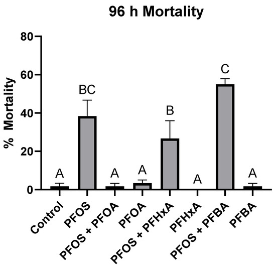 Tanabe, P.; Key, P.B.; Chung, K.W.; Pisarski, E.C.; Reiner, J.L.; Rodowa, A.E.; Magnuson, J.T.; DeLorenzo, M.E. Mixture Effects of Per- and Polyfluoroalkyl Substances on Embryonic and Larval Sheepshead Minnows (Cyprinodon variegatus). Toxics 2024, 12, 91. https://doi.org/10.3390/toxics12010091