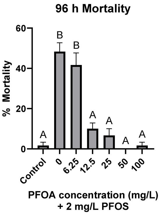 3.4. Antagonistic Effects of PFOA on PFOS-Induced Mortality