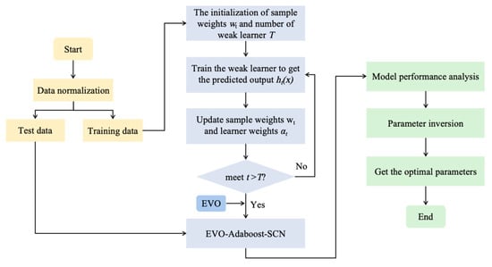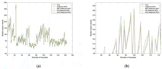 - The Adaboost–SCN model constructed in this paper is significantly superior to the single SCN model in terms of error rate, which fully validates the excellent performance of ensemble learning in reducing prediction errors and improving prediction accuracy. In order to accelerate the model training process and improve the prediction ability, three efficient feature selection methods were selected in this study: the maximum information coefficient (MIC), random forest (RF) and energy valley optimizer (EVO), which effectively helped the Adaboost–SCN model focus on key features. In particular, the Adaboost–SCN model combined with the EVO algorithm shows remarkable performance with an R2 value of 0.9849, which indicates that the predicted data are in good agreement with the experimental data;