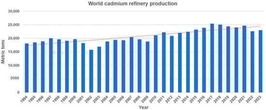 Cadmium (Cd) is a non-essential trace element that is naturally present throughout the environment. It primarily exists in association with zinc sulfide and is found in the Earth’s crust at a concentration of 0.15 mg/kg and in the sea at 1.1 × 104 mg/L []. Cd can be released into aquatic environments through natural processes such as volcanic activity, weathering of Cd-containing rocks, and forest fires []. Moreover, anthropogenic sources such as mining, smelting, industrial processes, urban runoff, and agricultural activities, significantly increase the Cd concentration in aquatic environments. They contribute approximately 90 percent of the Cd found in these environments, posing significant environmental risks []. World Cd production has shown a steady increase from 18,100 tons in 1994 to 23,000 tons in 2023, despite a slight decline in the past seven years (Figure 1). In the U.S., industrial and manufacturing facilities, along with mining operations, disclose the quantities of Cd and Cd compounds released into the environment through the EPA Toxics Release Inventory (TRI) Program. Data from the TRI reveals that the annual average environmental release of Cd and Cd compounds across all industries reached approximately 4.4 million pounds in 2022.