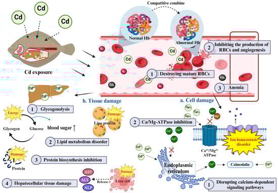 In the aquatic environments, Cd compounds can transition between various phases through processes such as chelation, adsorption, desorption, and precipitation and dissolution []. These processes facilitate the exchange of Cd between water and sediment. Cd can form various chemical species including ions and complexes with inorganic ligands (e.g., Cl−, SO42−, HCO3−, and F−), as well as organic ligands (e.g., amino acids, citrate, oxalate, salicylate, fulvic acid, and humic acid) [,]. These complexes influence the solubility and mobility of Cd compounds in water. The various forms of Cd, including both charged and neutrally-charged complexes, influence its bioavailability to aquatic organisms []. Charged species generally require specific transport mechanisms to pass across cell membranes. In contrast, the behavior of neutrally charged complexes is chemically similar to non-ionic organic compounds, allowing them to pass across cell membranes freely via passive diffusion [,]. Due to these properties of Cd, it is absorbed by aquatic organisms through the gills and epithelial cells of the digestive tract. After uptake, Cd may bind with transport proteins in the plasma and be distributed to various organs via the circulatory system. It forms complexes with small peptides or proteins that contain sulfhydryl groups, such as glutathione, or with metal-binding proteins such as metallothionein. These complexes often attach to RBC surfaces, facilitating their transport throughout body. Additionally, Cd can accumulate in cells by replacing essential divalent cations in calcium channels or by interacting with zinc transporters []. Cd toxicity can be further exacerbated by its non-biodegradability and potential for accumulation in tissues, enabling it to exhibit high toxicity even at low concentrations []. Cd toxicity can lead to various physiological damage including growth retardation, reduced survival rates, metabolic disturbances, enzyme inhibition, decreased immunity, oxidative stress, and neurological disorder [,,,,]. In brief, when fish are exposed to Cd, the energy required to detoxify accumulated Cd in tissues may reduce the energy available for growth, resulting in growth retardation and reduced survival rates [,]. Cd exposure increases the nuclear and cytoplasmic deposition of lipid droplets in hepatocyte, leading to disruption of lipid metabolism []. Cd produces reactive oxygen species (ROS), leading to significant cellular damage, triggering inflammation, and promoting apoptosis through DNA damage and protein oxidation []. Cd exposure causes a significant neurotoxicity to fish by inhibiting sulfhydryl-containing enzyme activity and causing neuronal damage in the brain [].