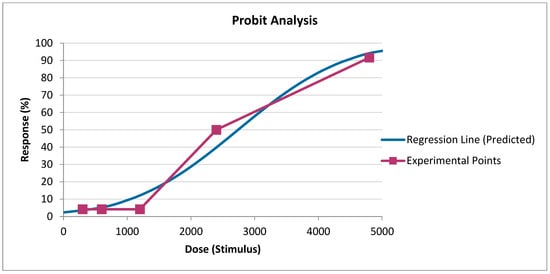 The LD50 values presented in Figure 1 indicate that the sigmoidal dose–response curves and their 95% confidence intervals quite convincingly highlight the dose dependence of drilling mud toxicity. At the same time, the plotted curves using logistic regression once again prove that drilling mud at doses of 2400 and 4800 mg/kg has a lethal effect on experimental animals.