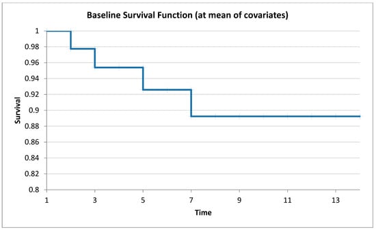 Using the Cox proportional intensity model, we established the survival of animals in an acute experience experiment with oral administration of drilling mud. Table 3 and Figure 3 show that the death of animals occurs on the 2nd, 3rd, 5th, and 7th days of the experiment. LD50 was 2800 mg/kg (lower level of the risk index—0.9997, upper level of the risk index—1.0010).