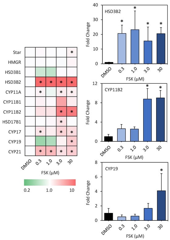 HSD3B2 was the most severely affected. The transcriptional levels were induced by 20.7, 23.2, 15.6, and 20.5 times (fold change) in the cells upon 0.3 μM, 1.0 μM, 3 μM, and 30 μM FSK exposure, respectively. Following this,