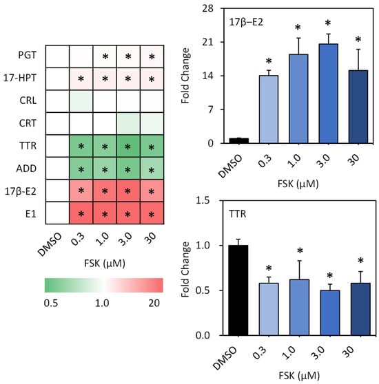 Figure 2). Following this, 17-HPT exhibited remarkable inductions in its concentrations by 2.9, 3.1, 2.8, and 3.2 times in the cells upon exposure to 0.3 μM, 1.0 μM, 3 μM, and 30 μM FSK, respectively. Meanwhile, dose-dependent increases in PGT concentrations were also observed. Significant inductions by 1.5, 1.6, and 2.1 times in cells upon exposure to 1 μM, 3 μM, and 30 μM FSK, respectively, were observed. In comparison, TTR and ADD were slightly inhibited. Their concentrations decreased by 0.6, 0.6, 0.5, and 0.6 times, and 0.6, 0.7, 0.6, and 0.7 times in cells upon 0.3 μM, 1.0 μM, 3 μM, and 30 μM FSK exposure, respectively (