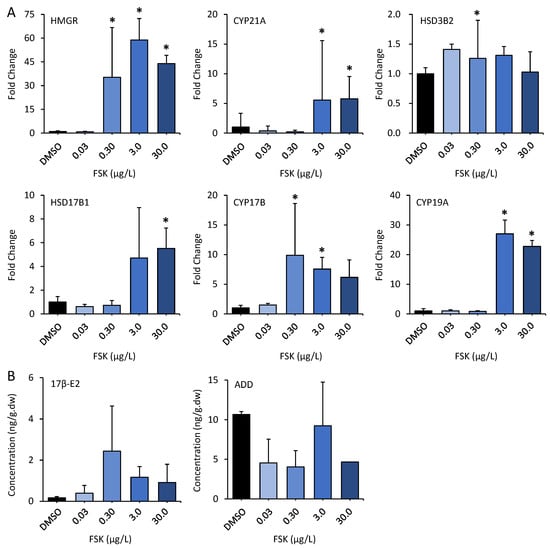 6 cells/mL per well in a six-well cell culture plate. After growth for at least 24 h, the culture medium was removed, and cells were exposed to 2 mL of dosing solution at four serial concentrations of FSK (0.3 μM, 1 μM, 3 μM, 30 μM) for 48 h. The concentration range was selected based on the results of our preliminary experiments. The concentration of DMSO in each test was kept constant at 0.1%. All treatments were conducted in triplicate. After 48 h of exposure, the cell culture supernatant collected from exposure wells was collected and stored at −80 °C for hormone analysis. The adherent cells in each well of 6-well plates were used for isolation of total RNA using Trizol reagent (Invitrogen Life Technologies, Carlsbad, CA, USA). Nucleic acid isolation, expression analysis of target genes by RT-PCR, and hormone analysis by UPLC/MS-MS were performed as we described previously [