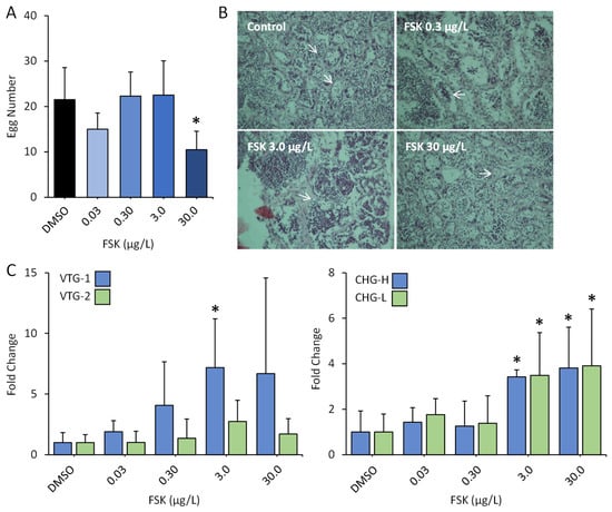 −1 at 25 ± 1 °C. Exposures took place in glass containers of progressively larger sizes (i.e., 2 and 12 L) as the medaka grew. We prepared stock solutions of FSK in DMSO and administered the stock solutions into exposure systems at a ratio of 100 μL of stock solution per liter of water. The concentrations for FSK were set at 0.03, 0.3, 3, and 30 μg/L. The concentration range was selected based on the results of our preliminary experiments. The aqueous solutions in the test containers were renewed every 24 h during the exposure period. Each treatment included 60 fish at the start of the experiment. The fish were maintained in a light/dark cycle of 16:8 h and were fed a diet of newly hatched brine shrimp twice daily. During the final exposure week, reproduction and larval development experiments were carried out. Spawned eggs were collected daily at 2–3 h after fertilization. Mean numbers of spawned eggs were calculated. Larval development was examined using a Leica M165 FC (Made in Singapore). Larvae with deformations were identified and recorded. After the exposure, medaka fish were euthanized with tricaine methane sulfonate (MS-222). Phenotypic sex of individual medaka was assessed by examining externally visible secondary sex characteristics under a dissecting microscope. Then, six males were sampled from each group for gene expression analysis of the liver and gonads, which were frozen in liquid nitrogen until the RNA was isolated.