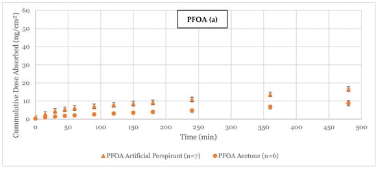 Cumulative absorption (ng/cm2 ± standard error) measurements of PFOA (a), PFHxA (b), and PFBA (c) through porcine skin using flow-through with either artificial perspirant or acetone as a vehicle with n replicates.