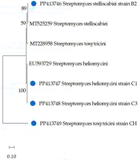 Neighbor-joining phylogenetic tree based on 16S rRNA gene sequences, showing the nearest neighbors of the isolated strains. GenBank accession numbers are indicated next to the branches. Blue dot labels bacterial species.