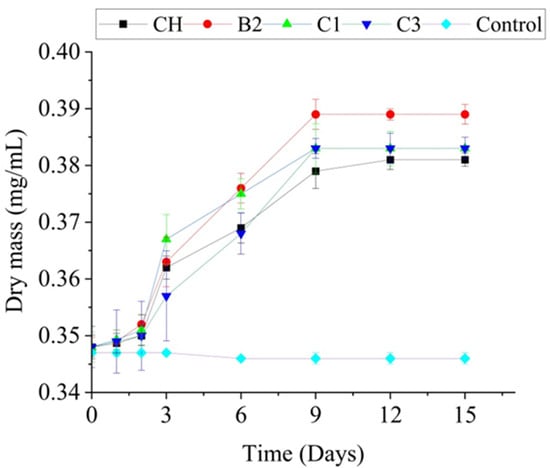 Screening on solid media revealed that all four isolates (CH, B2, C3, C1) exhibited good growth at metribuzin concentrations ranging from 1 to 50 mg/L as the sole source of carbon. Furthermore, kinetic studies in liquid medium supplemented with 50 mg/L metribuzin demonstrated that the isolates were able to rapidly utilize the herbicide as the sole carbon source, with a lag phase in the first 2 days of incubation. Among the active strains, B2 exhibited the most robust growth, with a 4.1% increase, followed by C1 and C3 with a 3.5% increase, and CH with a 3.3% increase (Figure 2). No significant difference was observed in the growth of actinobacterial isolates CH, B2, C1 and C3 in the presence of metribuzin at 50 mg/L (p-value > 0.05).