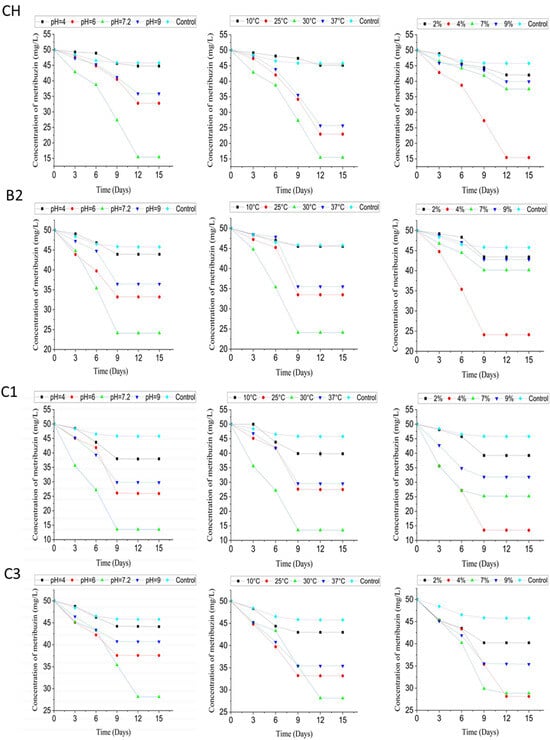 The results of metribuzin biodegradation by bacteria CH, B2, C1, and C3 under different pH conditions, temperatures, and inoculum volumes are presented in Figure 3.