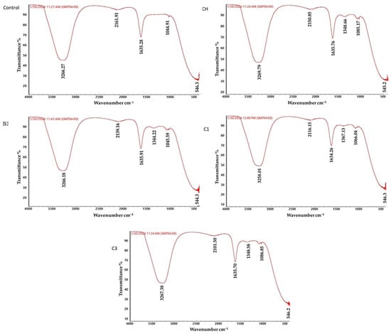 The structural changes in metribuzin and its biodegraded metabolites produced by various bacterial strains are shown in Figure 4. The characteristic C-O bond of metribuzin was observed at 1044.911 cm−1 in the control sample, and was also detected in the spectra of bacteria CH, B2, and C3 at the wavenumber 1045 cm−1. Interestingly, this peak was absent in the spectrum of bacteria C1, indicating a potential alteration in or cleavage of the C-O bond during the biodegradation process. Furthermore, the appearance of new peaks from 1085 to 1086 cm−1 in the bacterial samples CH, B2, C1, and C3 suggests the formation of C-N bonds, which were not present in the metribuzin control. This observation implies the occurrence of structural modifications, likely involving the introduction of nitrogen-containing functional groups, during the bacterial transformation of metribuzin. Notably, additional peaks were observed at wavenumbers from 1344 cm−1 to 1357 cm−1 in the spectra of bacteria CH, B2, C1, and C3. These peaks, which were absent in the metribuzin control, may correspond to C-H or O-H vibrations, suggesting the formation of new functional groups or an alteration in the existing ones during the biodegradation process. The presence of peaks at 1634 cm−1 and 1635 cm−1 in the control and all bacterial samples indicates the persistence of the NH group, a characteristic feature of the metribuzin molecule, throughout the biodegradation reactions. Interestingly, the bacterial strains CH, B2, C1, and C3 exhibited peaks corresponding to the C-O bond at wavenumbers from 2101 cm−1 to 2150.853 cm−1, which differed from the C-O peak observed at 2160 cm−1 in the metribuzin control. These shifts in the C-O bond frequency suggest structural modifications in or the formation of new C-O moieties during the biodegradation process. Finally, the O-H bond, as indicated by the peak at 3266 cm−1 in the metribuzin control, was detected in the bacterial samples CH, B2, C1, and C3 at wavenumbers from 3258 cm−1 to 3269 cm−1, with subtle differences in peak intensity. Overall, the ATR-FTIR analysis revealed significant structural changes in metribuzin upon biodegradation by the various bacterial strains.