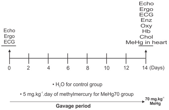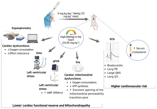 Female BALB/c mice were acquired from the Laboratory Animal Breeding Center, Oswaldo Cruz Institute Foundation, Brazil. At eight weeks of age, with an average weight of 18 g, they were subjected to heart function analyses by echocardiography (Echo), electrocardiography (ECG) and ergospirometry (Ergo) prior to MeHg administration. Animals subsequently received a daily dose of MilliQ ultrapure water (MILLI-Q DIRECT-Q5, Millipore) (20 µL/g body weight; control group) or 5 mg.kg−1 methylmercury chloride (Methylmercury(II) chloride PESTANAL® Merck analytical standard, purity > 97.8%) by gavage over 14 days (cumulative dose of 70 mg.kg−1; MeHg70 group). MeHg was diluted in MilliQ ultrapure water (2.5 mg/10 mL) and gently shaken for 30 min in a glass vial protected from light before gavage (20 µL/g). Then, both groups were subjected to the same heart function analyses. Body weight, survival rate, blood haemoglobin (Hb) content and MeHg concentration in heart tissue were also measured. All the animals were euthanised by cervical dislocation preceded by anaesthesia with 100 mg.kg−1 ketamine and 10 mg.kg−1 xylazine. Heart tissue samples were collected for high-resolution oxygraphy (Oxy), as well as for analyses of citrate synthase activity (CS), succinate dehydrogenase activity (SDH) and ATPase activity of complex V. mRNA for relative quantification by qPCR was isolated (see Figure 1). All reagents used in these assays were purchased from Sigma–Aldrich (St. Louis, MO, USA) unless otherwise indicated. They were individually identified and maintained under a 12 h light/dark cycle at 25 °C. They were also provided free access to filtered water and a standard rodent diet (Nuvilab, from Quimtia, PR, Brazil) at a local animal facility (Institute of Biophysics Carlos Chagas Filho—IBCCF, UFRJ, Rio de Janeiro, Brazil). This study was approved by the Ethics Committee on the Use of Animals of the Health Sciences Centre of the Federal University of Rio de Janeiro, Brazil (CEUA/CCS/UFRJ, CONCEA registration # 01200.001568/2013.87, approved protocol IBCCF 027/14). The animals received care in compliance with the “Principles of Laboratory Animal Care” formulated by the National Society for Medical Research and the “Guide for the Care and Use of Laboratory Animals” prepared by the National Academy of Sciences, USA, and the National Council for Controlling Animal Experimentation, Ministry of Science, Technology and Innovation (CONCEA/MCTI), Brazil.