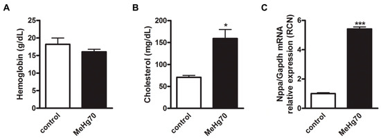 (A) Blood haemoglobin (g/dL, N = 5): (B) Serum total cholesterol (mg/dL, N = 5); (C) Atrial natriuretic peptide mRNA expression (nPPA gene) was measured in the heart tissue of mice in the MeHg70 and control groups (normalised to glyceraldehyde-3-phosphate dehydrogenase (GAPDH) mRNA expression), (N = 4). The bars represent means ± SEs. * p < 0.05 and *** p < 0.001.