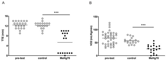 Ergospirometry. The pretest results and retest results for the MeHg70 group and the control group are shown: (A) Time of tolerance to effort (TTE). N = 21 (pretest), 18 (control group), 18 (MeHg70 group); (B) Peak oxygen consumption (VO2). N = 39 (pretest), 18 (control group), 19 (MeHg70 group). *** p < 0.001.