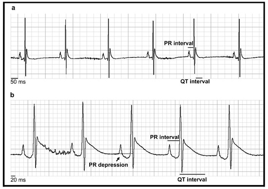 In Figure 4, a representative ECG of one animal from the control group is compared with an ECG from one animal from the MeHg70 group, in which impaired ventricular depolarisation and repolarisation were observed. The animal whose ECG is shown was one of the animals from the MeHg70 group that displayed P-R interval slowing, characterised by atrioventricular conduction delay. In addition, P-R depression was observed. These P-R changes are likely the result of myocardial inflammation, as described in human myopericarditis [60,61].