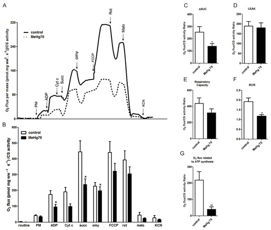 High-resolution oxygraphy of permeabilised heart fibres: (A) Representative traces of one animal from the control group (continuous line) and the MeHg70 group (dotted line). The arrows represent the administration of each substrate. PM = pyruvate + malate; ADP = adenosine diphosphate; Cyt c = cytochrome c; succ = succinate; omy = oligomycin; FCCP = p-trifluoromethoxyphenylhydrazone; rot = rotenone; malo = malonate; and KCN = potassium cyanide. (B) High-resolution oxygraphy results for the MeHg70 group (black bars) and control group (white bars). The bars represent means ± SEs. O2 flux is plotted in the routine state (without exogenous substrates), and after the addition of pyruvate + malate (PM), ADP, cytochrome c (Cyt c), succinate (succ), oligomycin (omy), p-trifluoromethoxyphenylhydrazone (FCCP), rotenone (rot), malonate (malo), and potassium cyanide (KCN); ww = wet weight. (N = 9) * p < 0.05. (C–G) High-resolution oxygraphy of permeabilised heart fibres from the MeHg70 and control groups normalised to mass and citrate synthase activity. (C) mtVO2 increased after the addition of succinate. (D) Leak state. (E) Respiratory capacity. (F) RCR = respiratory control ratio. (G) mtVO2 is related to ATP synthesis. The bars represent means ± SEs. N = 9, * p < 0.05, ** p < 0.01 when data from animals from the MeHg70 group were compared to animals from the control group.