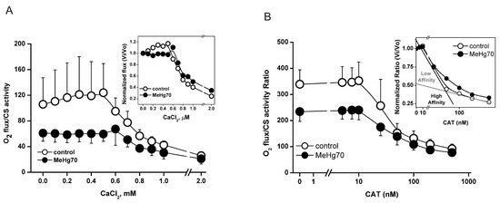 mtVO2/citrate synthase activity in permeabilised heart fibres of the MeHg70 and control groups normalised to heart fragment mass. The experiment was performed in the presence of pyruvate and malate (complex I substrates), succinate (complex II substrate) and ADP (A) Ca2+ titration for MPTP induction. (B) Carboxyatractyloside (Cat) titration to inhibit oxygen consumption related to complex V. The data represents ± SEs. The inset shows the changes normalised to the basal values of mtVO2 (N = 3).