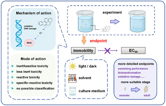 There are limited reports on BaP acute toxicity tests on Daphnia magna. However, the acute toxicity values in these reports exhibit significant variations. In general, the most frequently reported endpoints for D. magna primarily revolve around “immobility”, with little attention given to chronic and sublethal effects such as genotoxicity and reproductive inhibition [17,18]. Apparently, “immobility” may be the most straightforward and primary ecotoxicity endpoint and cannot provide complete information on the MOA of BaP in D. magna. Therefore, “immobility” might not be sensitive enough to mirror the ecological risk in aquatic ecosystems. What are the possible causes of the extreme variations in the BaP acute toxicity test on D. magna? This study aims to investigate whether relying on inhibition as the primary toxicity endpoint for assessing the toxic effects of BaP is reasonable (Figure 1).