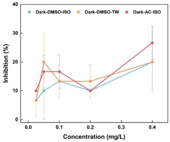 According to the guidelines of the OECD, light avoidance experiments should be carried out when the test compounds exhibit instability under natural light [19]. Because of the photodegradation of BaP [28,29], our initial experiments were conducted under dark conditions. The acute toxicity tests of BaP with different culture media and solvents are displayed in Figure 2. Within the concentration range of 25 μg/L to 400 μg/L, the inhibition of D. magna by BaP is consistently below 30%. No significant differences between the three treatments (DMOS + TW, DMOS + ISO, and AC + TW, all under dark conditions) were observed based on the t-test (p > 0.05). This result indicates that AC and DMSO as solvents and ISO standard water and dechlorinated tap water as culture media do not have a significant impact on acute toxicity. As higher concentration experiments were conducted next, the presence of AC when adding more BaP could affect D. magna, potentially interfering with the experimental assessment. Therefore, considering the severe toxicity of AC to D. magna, only DMSO was used as the solvent in subsequent experiments.