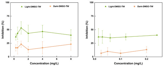 As mentioned above, the EC50 cannot be obtained under dark conditions. Again, those previous works did not declare whether light was avoided during testing. Therefore, in this study, experiments with light exposure with higher BaP levels were conducted with the same light duration as the original culture conditions. During the light experiments, only low toxic effects were observed, with BaP levels growing from 25 μg/L to 8000 μg/L (Figure 3). Moreover, under light, regardless of changes in concentrations, the inhibition of D. magna always stabilized at ~50%. For both light and dark experiments, there was no obvious trend in the inhibition of BaP on D. magna with respect to concentration variations, making it unfeasible to calculate the EC50. A t-test showed that there was a significant difference between the light and dark experiments (p < 0.05), suggesting that light could improve the inhibition of BaP on D. magna.