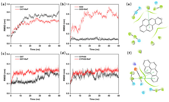To further explore the possible mechanisms of action, we selected enzymes that significantly influence the oxidative stress process in D. magna, i.e., Catalase (CAT), Superoxide Dismutase (SOD), Glutathione S-transferase (GST), and Cytochromes P450 (CYP450), to conduct molecular docking and molecular dynamics (MD) simulations with BaP. A 50 ns MD simulation of the dynamics of four complexes was conducted. The root-mean-square deviation (RMSD) of GST + BaP and CYP450 + BaP did not fluctuate greatly (<0.3 nm), which indicated that there was a stable system and stronger binding between the compound and the protein (Figure 4c,d). As is shown in Figure 4e,f, Pi–Pi stacking interactions (including van der Waals interactions and electrostatic interactions) were formed between proteins and residues, which increased the binding stability. The bindings of BaP with SOD and CAT were poor, suggesting that BaP does not occupy these enzymes (Figure 4a,b). CAT and SOD are primarily responsible for helping the body eliminate ROS, preventing oxidative damage to the body. GST and CYP450 are transferases and metabolic enzymes that seek to excrete pollutants or toxins from the body. Therefore, BaP binds with GST and CYP450 stably but not well with CAT and SOD. This not only ensures that the normal removal of ROS in the body is unaffected but also allows BaP to be quickly excreted by metabolic enzymes and transferases. As a result, it does not cause significant harm to D. magna.