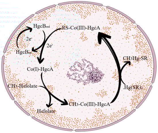 By the 1970s, different studies had identified biomethylation of inorganic Hg in the sediments of Swedish rivers, lakes, and coastal waters []. Afterwards, many researchers conducted studies on the above findings. Methylation of mercury by biological pathways might occur either enzymatically or non-enzymatically. Enzymatic methylation of mercury requires the existence of active metabolizing organisms, whereas non-enzymatic methylation of mercury requires only the products of active metabolic methylation. The detailed mechanism of mercury methylation was first investigated and discovered by Wood et al. []. This study found that methylcobalamin, a derivative of vitamin B12 generated in numerous living organisms, is involved in the process of microbial mercury methylation. It was also proposed that this procedure is a non-enzymatic shift of methylcobalamin to mercury ions. De Simone et al. [] demonstrated that the shift of methyl towards Hg2+ is a methylation (CH3−) process. Although many molecules are potential methyl donors in the aquatic environment, methylcobalamin is the only naturally occurring methylation reagent that can transfer methyl in the form of carbon ions, and is representative of the non-enzymatic biological methylation of mercury []. This ion transfer process is prevalent in anaerobic ecosystems and organisms. Methylcobalamin produced by microbial metabolism can cause spontaneous methylation of Hg2+ in aqueous solutions [] and is a major supplier of methylmercury in water. In addition, microorganisms capable of methylating Hg have also all been found in anaerobic, facultative anaerobic, and aerobic bacteria. However, the potential for mercury methylation by microorganisms is often greater during periods of anaerobic conditions. It has been demonstrated that the hgcA and hgcB genes regulate the process of mercury methylation in microorganisms and are the signature genes of Hg-methylated microorganisms. Parks et al. demonstrated the critical importance of the hgcA and hgcB genes in the mercury methylation process in some anaerobic bacteria, with the deletion of the hgcA and hgcB genes leading to changes in the physiological properties of the cell surface and affecting mercury interactions []. These genes encode a putative protease, hgcA, and a 2[4Fe-4S] ferredoxin, hgcB, with roles as methyl carrier and electron donor, respectively, required for protease cofactor reduction. The specific mechanism of action of the hgcA and hgcB genes is shown in Figure 1. In this study, the hgcA and hgcB gene clusters in two bacteria, Desulfovibrio desulfuricans ND132 and Geobacter sulfurreducens PCA, were required genes for mercury methylation. In both bacteria, the deletion of hgcA or hgcB resulted in the loss of mercury methylation. Further studies by Hui Lin and Richard A. Hurt, Jr et al. found that deleting hgcA and hgcB genes increased the rate of Hg(II) reduction and decreased the oxidation ratio of Hg(0), leading to the loss of methylation activity []. In additional studies involving a 40-kDa corrinoid protein in enzymatic Hg methylation, enzymatic methylation was more favoured when pH = 4.0 and the temperature was 32 degrees Celsius [,].