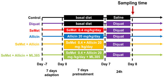 Mice were randomly divided into six groups (4 mice/group): control group, diquat group, SeMet + diquat group, allicin + diquat group, SeMet + allicin + diquat group, and SeMet + allicin+ ML385 + diquat group. Figure 1 shows that all mice were adapted for a week. The mice in the SeMet + diquat group, SeMet + allicin + diquat group and SeMet + allicin+ ML385 + diquat group received 0.4 mg/kg of SeMet by oral administration once a day for seven days. The mice in the allicin + diquat group, SeMet + allicin + diquat group, and SeMet + allicin+ ML385 + diquat group received 20 mg/kg of allicin by oral administration once a day for seven days. Meanwhile, mice in the SeMet + allicin+ ML385 + diquat group received a daily ML385 (30 mg/kg; dissolved in PBS with 5% DMSO) by intraperitoneal injection for seven days. The mice were treated with 25 mg/kg of diquat by intraperitoneal injection except the control group (treated with equivalent PBS). After another 24 h, blood was collected from the eyeballs of mice, collected into 1.5 mL EP tubes, and mice were euthanized by cervical dislocation to collect blood and jejunal samples. Finally, 4 h before sampling, four mice in each group were randomly selected and treated orally with 40 mg/mL of FD4 to assess intestinal barrier damage.