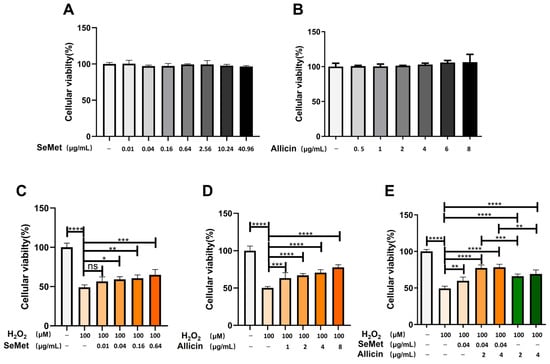 Effects of SeMet, allicin, or both on IPEC-J2 cell viability. (A,B) The effect of SeMet or allicin on the viability of IPEC-J2 cells after 12 h treatment. (C–E) Cell viability of IPEC-J2 cells in SeMet, allicin, and SeMet + allicin treatment for 12 h, followed by 100 μM of H2O2 or PBS (control group) for 6 h. Values are expressed as mean ± S.D. The symbols for the significance of differences: * p < 0.05; ** p < 0.01; *** p < 0.001; **** p < 0.0001; ns, insignificant. The same symbols represent the figures below.