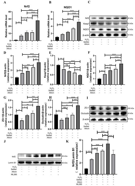 Effects of SeMet, allicin, or both in Nrf2 antioxidant pathway, Nrf2 nuclear translocation, and tight junction protein in IPEC-J2 cells. (A,B) IPEC-J2 cells were pretreated with SeMet, allicin, or both for 12 h and 100 μM of H2O2 for 6 h. The Nrf2 relative gene expression (Nrf2 and NQO1) was monitored by the q-PCR analysis. (C–I) Nrf2, NQO1, Keap1, ZO-1, and Occludin expressiona in total protein of cells were detected and analyzed by Western blot. (J,K) Cell nuclear proteins were separated, and Western blot analysis was conducted to determine the Nrf2 expression in the nucleus. Values are expressed as mean ± S.D. The symbols for the significance of differences: * p < 0.05; ** p < 0.01; *** p < 0.001; **** p < 0.0001; ns, insignificant.