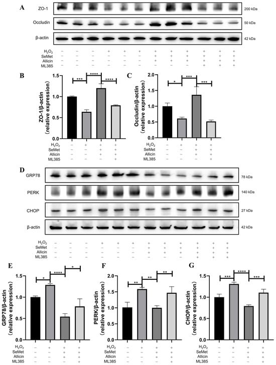 The Western blot indicated that SeMet and allicin could significantly enhance ZO-1 and Occludin expression, but the reverse effect of protein expression was blocked by ML385 (Figure 8A–C). Similarly, Western blot suggested that SeMet and allicin could significantly ameliorate GRP78, PERK, and CHOP protein expression, but ML385 reversed the decrease in these protein expressions (Figure 8D–G). These above results elucidated that SeMet and allicin inhibited ER stress and improved the tight junction by synergistically activating the Nrf2 signal pathway.