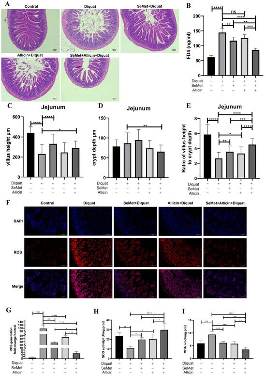 Effect of SeMet and allicin on the jejunum barrier function and antioxidative capacity. (A,C–E) Villous height, crypt depth, and relative ratios of villous height to crypt depth in the jejunal tissues. (B) Effect of SeMet and allicin on the serum FD4 content. (F,G) ROS production was quantified and analyzed. (H,I) The jejunum samples were homogenized and centrifuged, and then the supernatants were collected to detect SOD activity and MDA content (n = 4). Values are expressed as mean ± S.D. The symbols for the significance of differences: * p < 0.05; ** p < 0.01; *** p < 0.001; **** p < 0.0001; ns, insignificant.