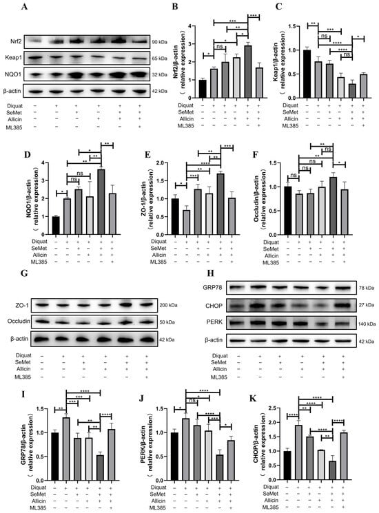 SeMet and allicin synergistically activate the Nrf2 pathway to mitigate diquat-induced oxidative stress and ER stress in mice. (A–D) Western blot was used to detect and analyze the expression of the Nrf2 signaling pathway (Nrf2, NQO1, and Keap1), (H–K) ER stress pathway (GRP78, PERK, and CHOP), and (E–G) tight junction protein (ZO-1 and Occludin) (n = 4). Values are expressed as mean ± S.D. The symbols for the significance of differences: * p < 0.05; ** p < 0.01; *** p < 0.001; **** p < 0.0001; ns, insignificant.