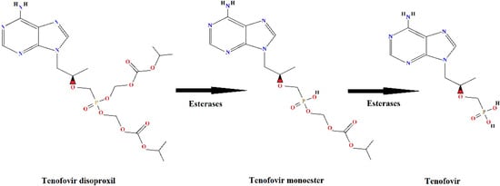 Tenofovir disoproxil fumarate (TDF) is an ARV of great importance because it is one of the first-line drugs, combined with other antiretroviral drugs, in HIV/AIDS treatment. Tenofovir is an analogue of the nucleotide adenosine 5′-monophosphate and acts by inhibiting the reverse transcriptase enzyme necessary for viral replication in human cells. Due to the low lipid solubility [] of tenofovir, it is administered as a prodrug, in esterified form, and it is de-esterified intracellularly to release the active portion of the molecule, tenofovir [,] (Figure 1).
