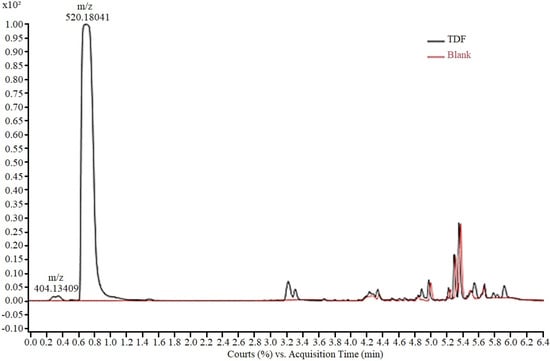 The analytical method for monitoring the experiments was developed using an aqueous solution of TDF (50.0 mg/L), analysed via HPLC-ESI-Q-TOF/MS. The presence of two peaks (Figure 2), a main peak (0.7 min) and a residual peak (0.3 min) was observed in the chromatogram. For peak characterization, the isolated ions in the mass spectrum were extracted and the corresponding chemical structure was proposed based on the exact mass obtained. Thus, the peak at 0.3 min, with m/z 404.13, according to the mass fragmentation pattern described by Kurmi et al. [], was assigned to tenofovir isoproxil protonated monoester (TMF). The peak at 0.7 min, with m/z 520.18 was attributed to protonated tenofovir disoproxil TDF [M + H +]. In the final elution time (after 4 min), no TDF-derived fragment was observed, with the final peaks corresponding to the gradient elution.
