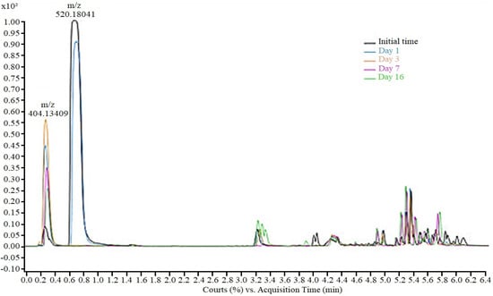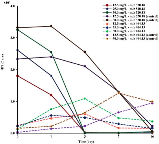Evolution of the peak areas at m/z 520.18 and m/z 404.13 obtained via HPLC/MS during TDF (at concentrations of 12.5, 25.0, and 50.0 mg/L) biodegradation by M. novacekii.