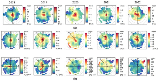 - Guo, H.; Ding, A.J.; Wang, T.; Simpson, I.J.; Blake, D.R.; Barletta, B.; Meinardi, S.; Rowland, F.S.; Saunders, S.M.; Fu, T.M.; et al. Source origins, modeled profiles, and apportionments of halogenated hydrocarbons in the greater Pearl River Delta region, southern China. J. Geophys. Res. Atmos. 2009, 114, 2008JD011448. [Google Scholar] [CrossRef]