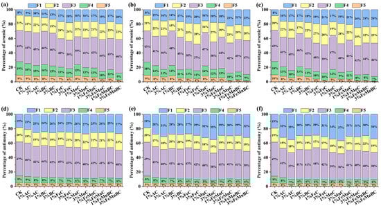 Changes in As speciation with different materials after 10 (a), 20 (b), and 30 days (c) and Sb speciation with different materials after 10 (d), 20 (e), and 30 days (f). (Note: F1: Residue state. F2: Crystalline iron-aluminium oxide bound state. F3: Amorphous iron-aluminum oxide bound state. F4: Specialized adsorption state. F5: Non-specific adsorption state).