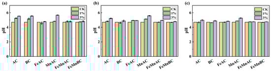 As shown in Figure 2, the addition of modified carbon materials resulted in temporal pH variation characterized by an initial rise followed by a decrease. Soil pH climbed due to three factors, including alkaline ions from modified carbon materials [], OH− generated by manganese oxidation, H+ consumed by iron oxidation, and organic functional groups like -COO- and -O-, together with carbonate species in biochar. Following their application to the soil, the alkaline moieties in BC and AC were rapidly discharged, neutralizing soil acidity and consequently elevating the soil pH []. With the extension of treatment time, soil pH decreased due to the consumption of alkaline base ions in modified carbon materials, and the impact of modified carbon material application on the soil pH buffering capacity was small []. A dosage of 3% of these materials typically yielded a significant increase in pH. The pH enhancements induced by AC and BC were quite similar, while FeAC, FeMnAC, and FeMnBC exhibited a smaller impact on pH. Compared with AC, the pH elevation induced by FeAC, FeMnAC, and FeMnBC was diminished. This was due to the specific properties introduced by the iron and manganese modifications, which affected the buffering capacity or altered the ionic interactions within the soil matrix, leading to a differential pH response compared with unmodified AC []. Due to the release of a significant amount of H+ through the hydrolysis of iron, the elevation of soil pH by FeMnBC, FeMnAC, and FeAC was less pronounced compared with their unmodified counterparts. However, MnAC had a stronger positive effect than AC. This phenomenon could be attributable to the oxidation of Mn, resulting in the production of OH− in the soil.