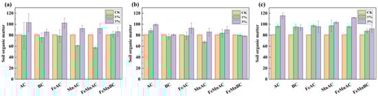 As shown in Figure 3, after the addition of carbon materials, the soil organic matter (SOM) with a 1% dosage initially decreased before showing an upward trend, whereas the SOM with a 3% dosage exhibited a pattern of increase. This was because of their high surface area and porous structures, which provided numerous sites for nutrient adsorption. Moreover, carbon materials could reduce nutrient leaching by binding nutrients within the soil matrix []. The enhancement of SOM was positively correlated with the dosage of carbon materials. AC demonstrated better efficacy in improving SOM than BC owing to its stronger adsorption capacity for SOM []. The improvement in SOM by FeAC, FeMnAC, and MnAC was inferior to that of AC, as Mn and Fe were adsorbed onto the pore structure of AC, thereby reducing its capacity to adsorb organic molecules and decreasing the synthesis of SOM. Initially, due to the increase in the specific surface area of BC by manganese oxide, FeMnBC was anticipated to adsorb more organic molecules, leading to a greater enhancement of SOM compared with BC. However, the improvement in SOM by 3% FeMnBC was found to be nearly identical to that achieved by 3% BC because the adsorption of Mn and Fe within the pore structure reduced the BC’s porosity. As a result, this inhibited the ability of FeMnBC to adsorb soil organic molecules, thereby hindering the synthesis of SOM.