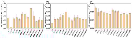 Changes in urease activity with different materials after 10 (a), 20 (b), and 30 days (c).
