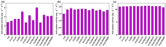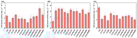 It can be seen in Figure 6 that compared with the control, the activity of sucrase was the highest after 10 days with 1% FeMnBC. On the one hand, it was because the soil enzymes were mainly adsorbed on the soil organic matter in the form of physical or chemical bonding, which changed the spatial structure and activity of the enzyme and avoided the influence of external adverse conditions []. On the other hand, the addition of 1% FeMnBC increased organic matter content, which subsequently enhanced soil fertility and elevated sucrase activity [,]. This activity continued to rise for approximately 20 days; however, since sucrase is involved in the decomposition of organic matter, an excess of organic matter ultimately inhibited sucrase activity, leading to a pattern in which sucrase activity initially increased and then decreased.