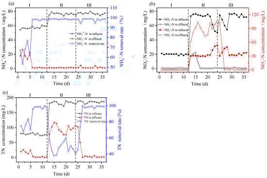 - Under the condition of a C/N ratio of 4.4, the TN removal rate could reach 96.7%, and the concentrations of NH4+-N, NO3−N, and NO2−-N in the effluent were all below 1.94 mg/L, 0.77 mg/L, and 0.77 mg/L, respectively, providing an effective method for the treatment of desulfurization and denitrification wastewater.